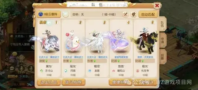 第一套是“控制输出流”:化生寺+月宫+魔王寨+女儿村+阴曹地府,宠物就用吸血鬼,记得打上连击技能。核心思路特清晰——女儿村先控住对面,地府放技能破防,化生寺给队友套盾保生存,吸血鬼借着破防的加成猛打,月宫和魔王再放群攻清场,刷任务速度贼快。 第二套是“暴力输出流”:大唐官府+双月宫+地府+化生,宠物带两个法宠,法连和神佑技能必须有。大唐和月宫全加力量,往死里堆输出;地府和化生加3敏2体,保证速度。出手顺序也有讲究,地府先上破防,化生紧跟着奶,剩下的就交给三个输出猛冲,打简单任务基本一回合结束。 第三套是“法系爆发流”:三魔王寨+普陀山+化生寺。普陀的“灵动九天”能加法伤,刚好适配全魔加点的魔王,输出直接拉满;普陀和化生还是3敏2体的加点,保证团队续航。这里得提醒一句,不管啥阵容,至少带两个辅助,不然连抓鬼这种基础任务都能打得磕磕绊绊。 再说说不同等级的玩法重点,新手别瞎逛,跟着节奏走才高效。1到27级没啥技巧,埋头做主线、支线和尘封任务就行,升级速度杠杠的。27级主线断了也别急,转头去抓鬼,搭配日常活动混到65级。这个阶段不用追求太好的装备,把师门、宝图、秘境、运镖、帮派任务这些简单日常清完就行。